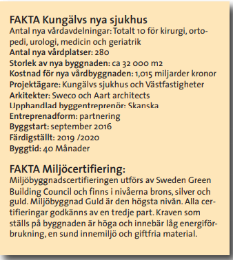 Kungälvs sjukhus behövde byggas ut på grund av antalet fler och äldre patienter samt behov av mer moderna lokaler. Sjukhuset och Västfastigheter gav uppdraget till Skanska och tack vare en miljömedveten kravlista och ett genomgående livscykelperspektiv har den nya vårdbyggnaden nu fått en preliminär certifiering för Miljöbyggnad Guld.