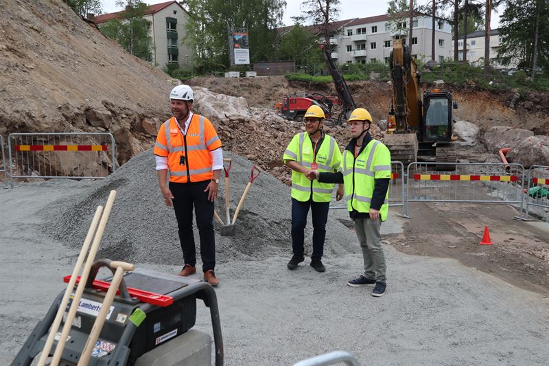 De tre bostadsbyggnaderna som växer fram här ligger intill den karaktäristiska talldungen som har fått sätta sin prägel på utformningen av husen. Den stilrena formen med sadeltak kopplar också an till det befintliga byggnaderna i området, men med en modern tappning. Ove Svanberg, projektchef på Peab, samt Kamran Rousta och Philip Jogner, som ska flytta in i projektet, hjälptes åt att ta det första spadtaget framför ett glatt gäng köpare och intressenter.