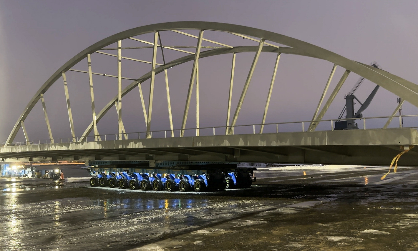 Den 44 meter långa och 18 meter breda vridbron fraktades på trailer från hamnen med start klockan 03.30. I vissa passager var marginalen endast cirka 40 centimeter på vardera sida om transporten. Flytten tog omkring två timmar innan bron nådde sin slutposition.