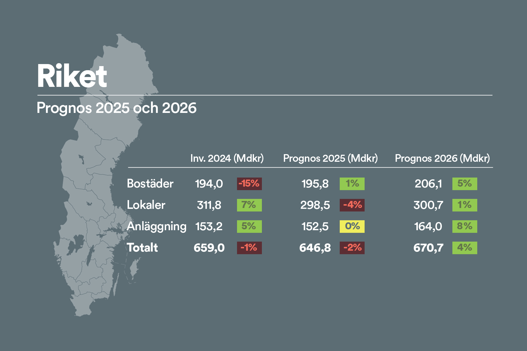 Totalt väntas investeringarna i bostäder, lokaler och anläggningar öka med knappt två procent under prognosperioden och uppgå till 670,7 miljarder kronor 2026. Sysselsättningen inom bygg- och anläggningssektorn bedöms öka med cirka 1 200 personer till 369 500.