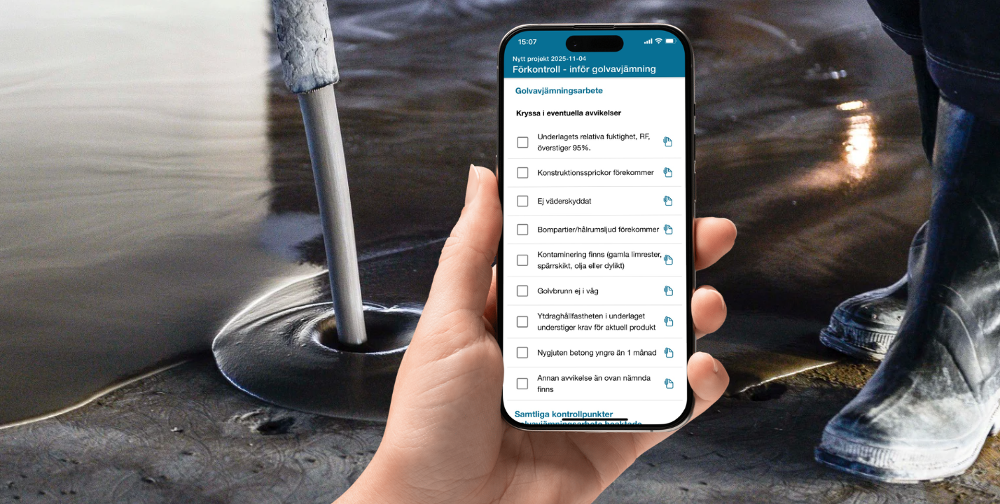 Sedan tidigare har appen använts för att dokumentera ytskikts- och tätskiktsarbeten. Genom att även inkludera golvavjämning täcks nu hela kedjan från förutsättningar till färdigt underlag, vilket ger bättre spårbarhet för entreprenader där vatten, avlopp och våtrum ingår. Funktionen innehåller relevanta kontrollpunkter för både planering och utförande.